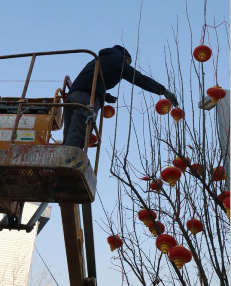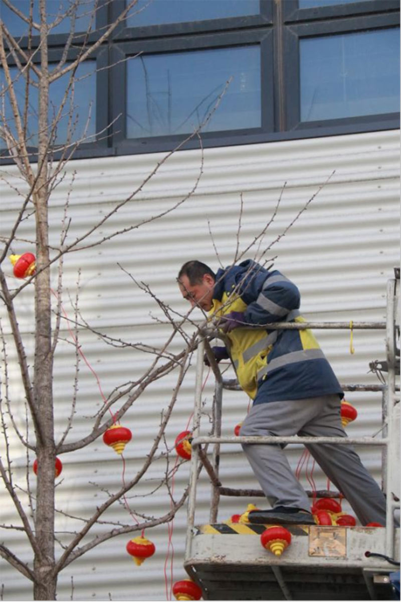 为给园区营造浓厚的节日气氛,给入驻企业带来如家般的温情呵护,沈阳航发展运营管理有限公司物业团队,在零下二十度的气温下,冻红了双手,冰覆了睫毛,但他们依然坚守,扶梯的扶梯、攀爬的攀爬,将火红的灯笼挂在园区主干道、企业门前。满街的火红,是他们对园区的热爱,也是对工作的执着,更是对岗位责任的满满执念。园区的灯亮了,客户们洋溢的笑脸,映衬着角落里一道道靓丽的风景线,夜幕降临下,五彩斑斓的彩色灯光给园区增添了不少喜庆的色彩,也深深的印在了师傅们热切的心里。